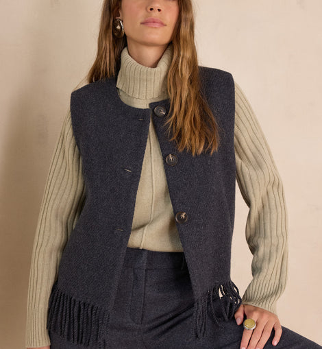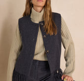 Craquez pour PAIGE, notre gilet en laine aux finitions raffinées. Ses franges apportent une touche bohème à ce modèle intemporel.