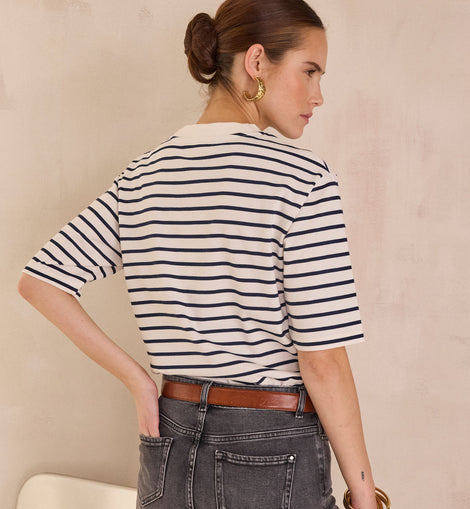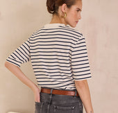 Découvrez LISETTE, notre t-shirt intemporel en coton pur. Sa rayure marine apporte une touche d'élégance décontractée à toutes vos tenues du quotidien.