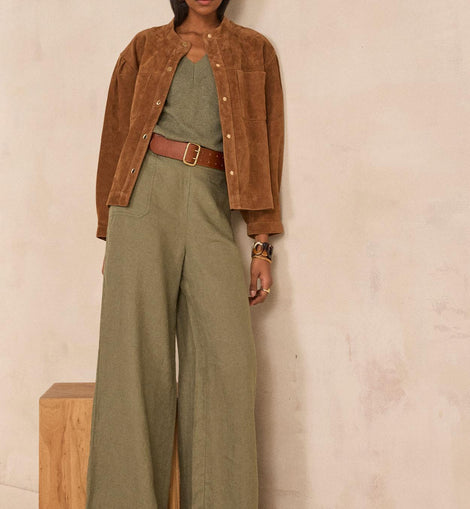 Découvrez le pantalon large TERRY et sa matière légère en lin.